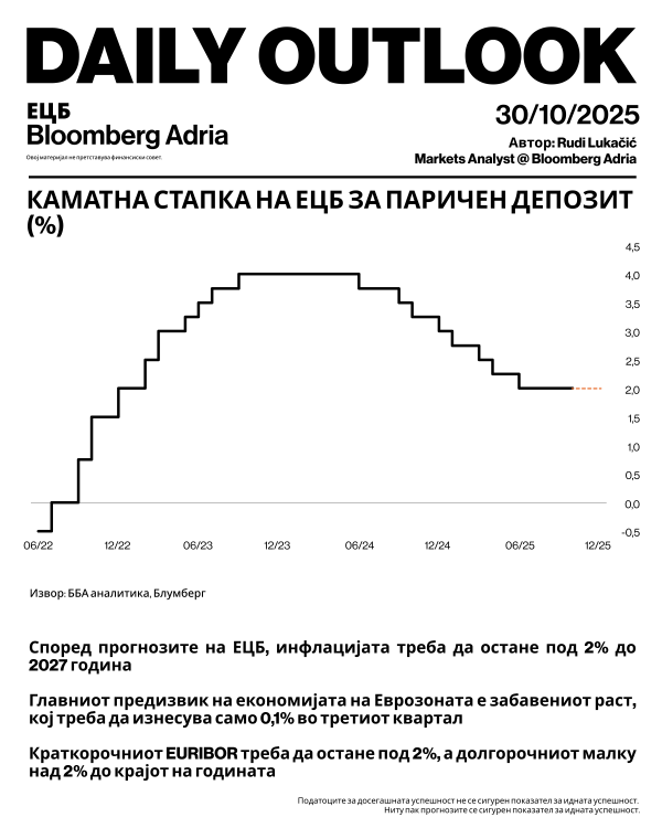 Европската централна банка ја задржа каматната стапка на два отсто, додека економијата на еврозоната расте стабилно, а инфлацијата благо се зголемува...
