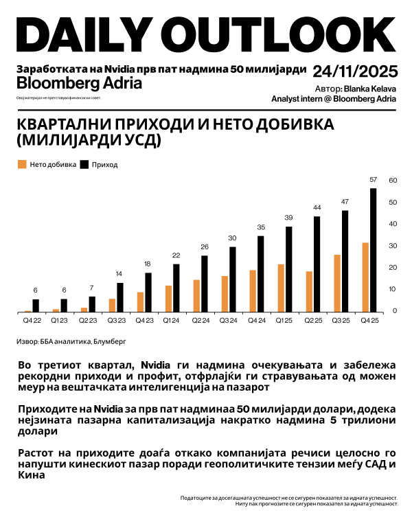 Пазарите реагираа позитивно по објавата на „Енвидија“ за нов силен квартал, што ги разби сомнежите за ВИ-балон и ја потврди рекордната побарувачка за акцелератори.