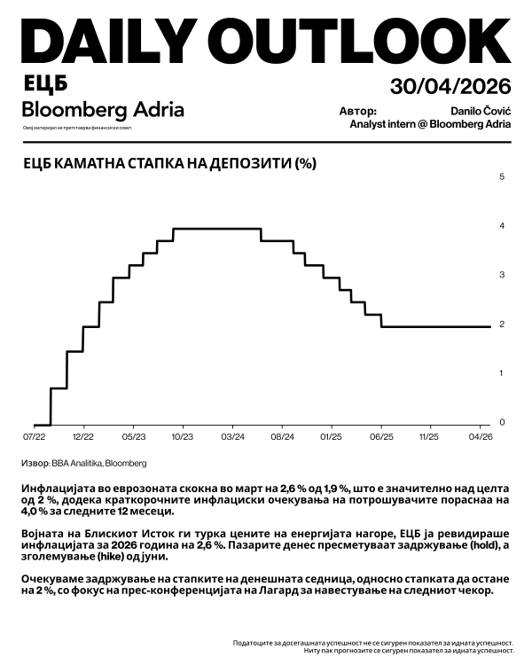 Европската централна банка ги задржа каматните стапки непроменети, при што официјалните лица сигнализираа дека им е потребно повеќе време за да ја проценат големината на шокот врз економијата предизвикан од војната во Иран.