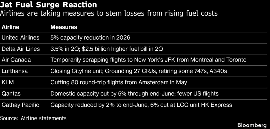 „Јунајтед ерланјс“ беше меѓу првите што најавија кратења, намалувајќи 5 отсто од капацитетот оваа година, со редукции до септември. „Делта“ се справува со повисоката сметка за гориво преку зголемување на цените и намалување на капацитетот за околу 3,5 отсто.