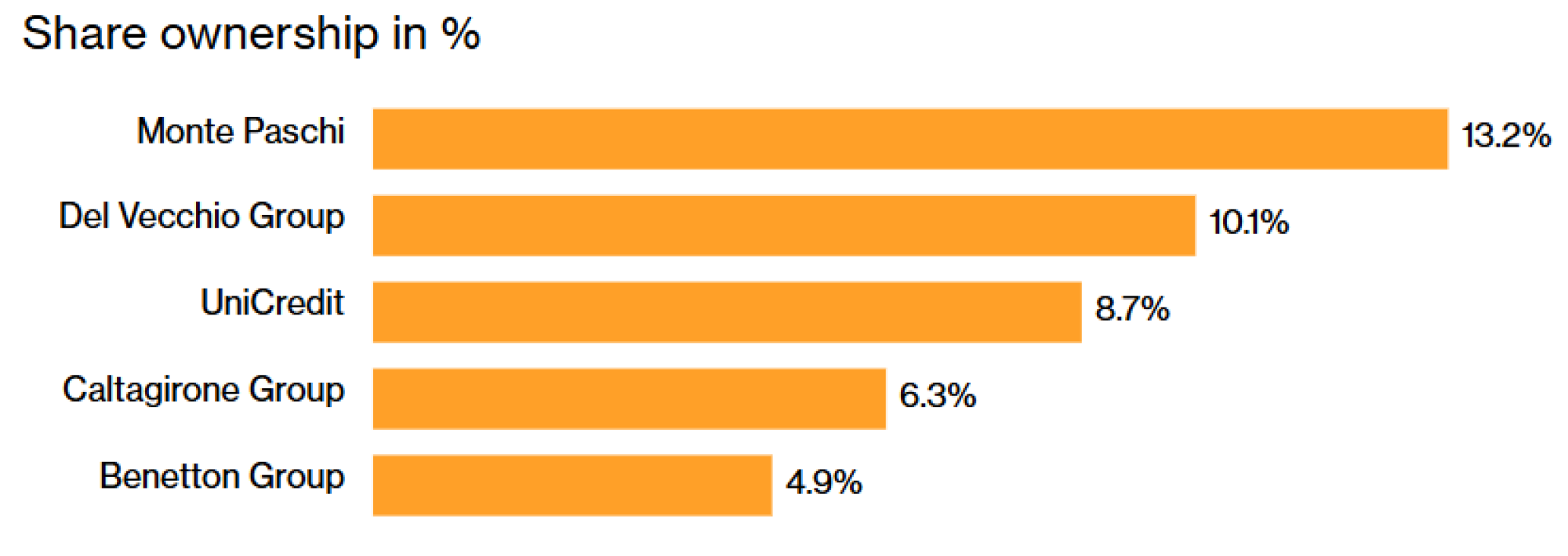 „Генерали“, кој моментно вреди околу 58 милијарди евра (68 милијарди долари), долго време е во центарот на различни обиди за склучување зделки, успешни и неуспешни, поради својата доминантна позиција во пензиското штедење и осигурувањето. Покрај „Уникредит“ (UniCredit), негови најголеми инвеститори се „Банка Монте деи Паски ди Сиена“ (Banca Monte dei Paschi di Siena SpA), семејството Дел Векио, градежниот тајкун Франческо Гаетано Калтаџироне и семејството Бенетон.