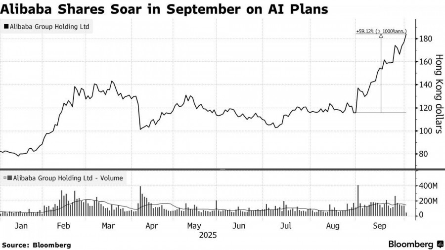 Акциите на „Алибаба“ котирани во Хонгконг скокнаа за 53 отсто во септември, што беше најдобар резултат на индексот Hang Seng. Инвеститорскиот ентузијазам нагло порасна откако компанијата објави планови за зголемување на вложувањата во ВИ над првичната цел од повеќе од 53 милијарди долари и ново партнерство со „Енвидија“ (Nvidia Corp.).