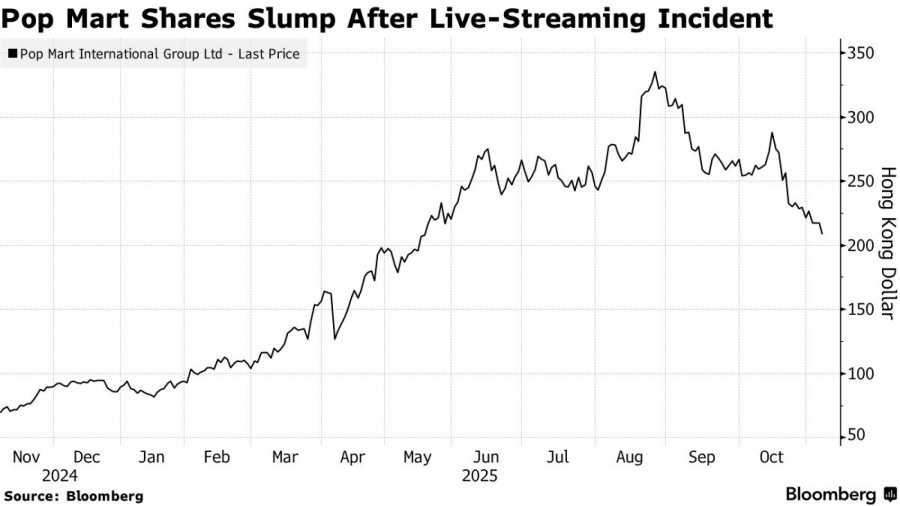 Акциите на „Поп Март“ (Pop Mart International Group Ltd.), производителот на популарната линија играчки Лабубу (Labubu), паднаа за повеќе од 5,5 отсто во петокот, достигнувајќи го најниското ниво од мај, по инцидентот со пренос во живо што повторно го разгоре прашањето за цените на производите.