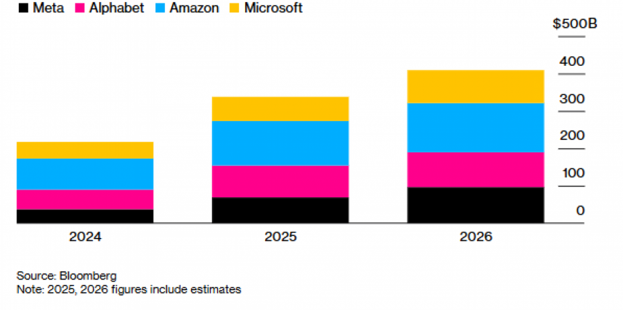 „Мета“ (Meta Platforms), „Алфабет“ (Alphabet), „Амазон“ (Amazon) и „Мајкрософт“ (Microsoft) заедно ќе потрошат повеќе од 400 милијарди долари следната година за проширување на капацитетите за вештачка интелигенција – зголемување од 21 отсто во однос на 2025 година – во трката за водство во новите технологии.