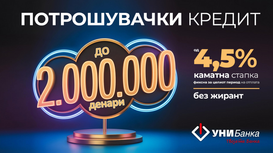 Во време кога цениме сигурност, брзина и едноставност, „УНИБанка“ подготви една од најповолните кредитни понуди на пазарот - кредит до 2.000.000 денари со фиксна каматна стапка од само 4,5 отсто, без жиранти и достапен со можност за целосна онлајн апликација.