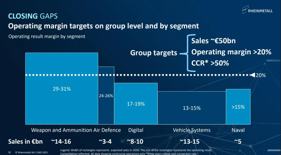 Ако се исклучат цивилните активности што компанијата наскоро ќе ги продаде, одбранбените бизниси на „Рајнметал“ веќе остваруваат оперативен поврат од продажбата од околу 18–19 отсто.