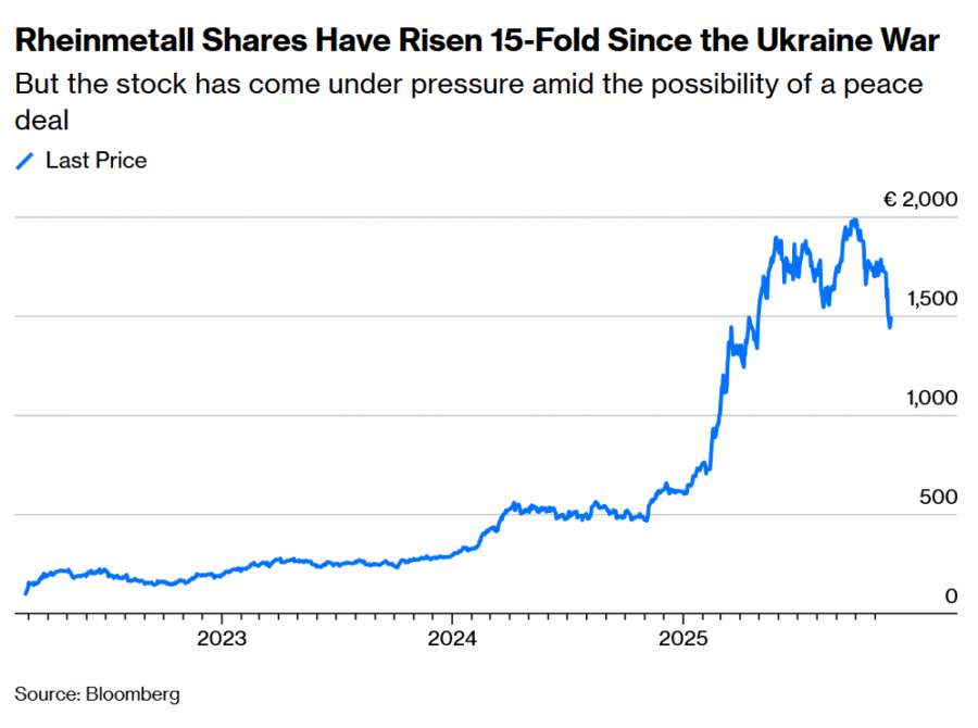 Акциите на „Рајнметал“ (Rheinmetall AG), најголемиот германски производител на одбранбена опрема, се под притисок во последно време поради очигледно поголемите шанси за мир во Украина.