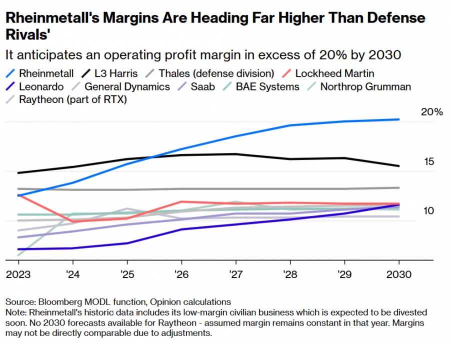 Иако е природно производител на оружје да профитира од превооружување – како што фармацевтските компании профитираа за време на пандемијата – очекуваната профитабилност на „Рајнметал“ значително се издвојува од другите западни одбранбени гиганти, како што покажува графиконот подолу.