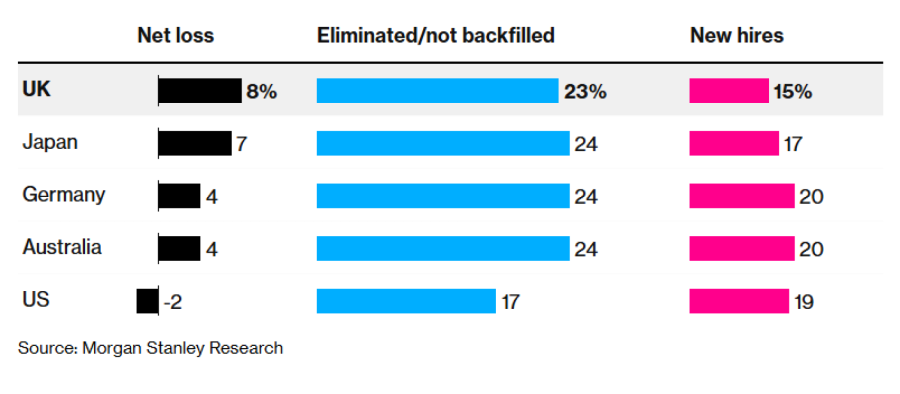 Според истражување на „Морган Стенли“ (Morgan Stanley), Велика Британија се соочува со сериозни предизвици на пазарот на труд поради вештачката интелигенција, губејќи повеќе работни места отколку што создава, и тоа побрзо од своите меѓународни конкуренти.
