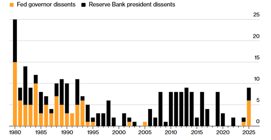 Пред неколку месеци се случи нешто многу невообичаено во Федералните резерви (Фед), иако веројатно само искусните набљудувачи на централната банка ја забележаа таа специфична промена. На состанокот за каматните стапки во декември, гласовите беа поделени — девет наспроти три. Девет членови на комитетот на Фед што ги одредува каматните стапки (вклучувајќи го и претседателот Џером Пауел) се согласија да ја намалат референтната стапка за четвртина процентен поен, додека двајца беа против намалувањето. Членот именуван од претседателот на САД Доналд Трамп, Стивен Миран, беше против бидејќи сметаше дека економските услови оправдуваат многу поголемо намалување.