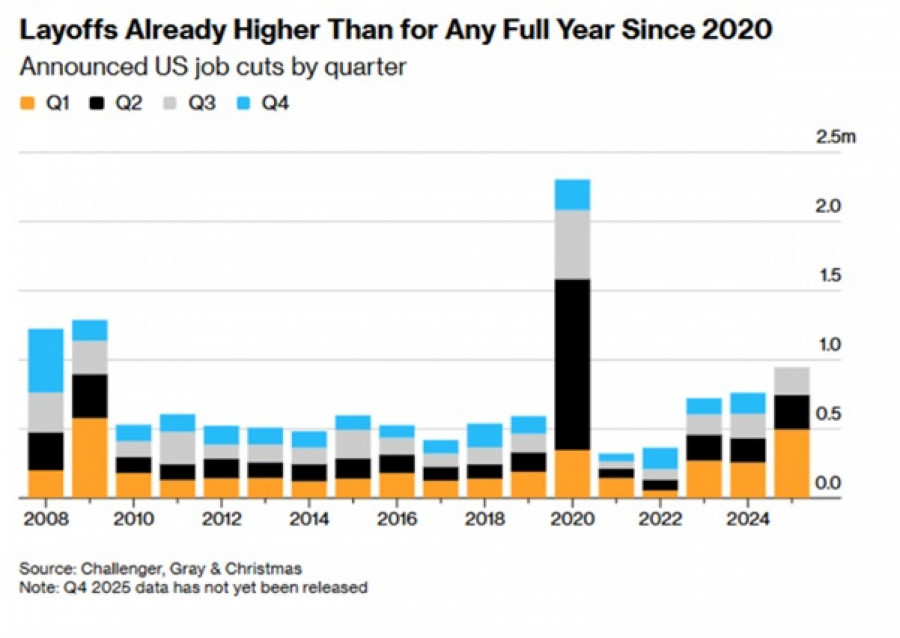 Извештајот на фирмата за вработување „Челинџер, Греј и Кристмас“ (Challenger, Gray & Christmas) покажа речиси 950.000 отпуштања во САД во 2025 година, и тоа само до септември, што претставува најголем број на отпуштања во тие девет месеци споредено со изминатите пет години. Со исклучок на првата година од пандемијата на ковид-19, бројот на отпуштања во САД само во деветте месеци веќе го надмина бројот на отпуштања во сите 12 месеци од секоја година почнувајќи од 2009-та. Кога некоја ситуација се толкува како речиси најлоша од големата рецесија, Норт вели: „Тоа не е баш охрабрувачки“.