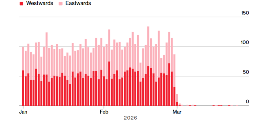 Дневни преминувања на комерцијални бродови низ Ормускиот Теснец, 1 јануари – 24 март