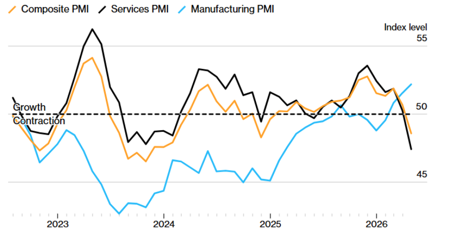 Composite Purchasing Managers’ Index, изработен од „С&П Глобал“ (S&P Global), се намали од 50,7 на 48,6 во април во претходниот месец, паѓајќи под границата од 50 поени што го дели растот од падот. Аналитичарите очекуваа намалување на 50,1.
