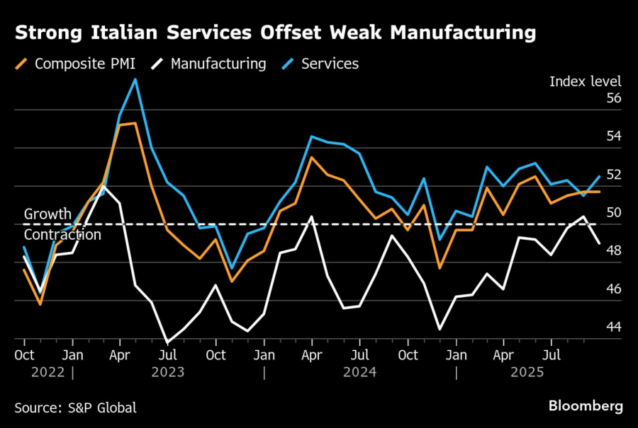 Индексите на менаџери за набавка објавени во петокот покажаа „слика на раздвојување“ во приватниот сектор на Италија. Додека вкупниот индекс остана стабилен, бројката за услуги достигна највисоко ниво од мај наваму, ублажувајќи го континуираниот пад во производството.