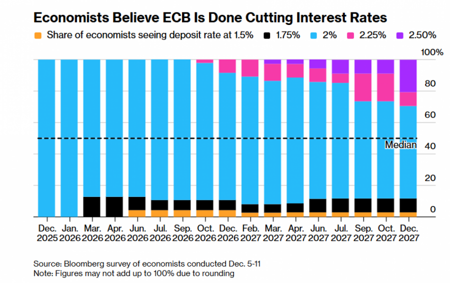 Европската централна банка (ЕЦБ) ќе ги задржи трошоците за задолжување во еврозоната на два процента до 2027 година, покажува анкета меѓу економистите спроведена од „Блумберг“.