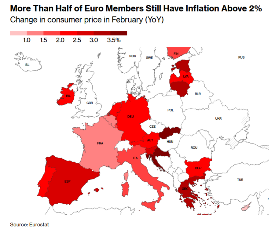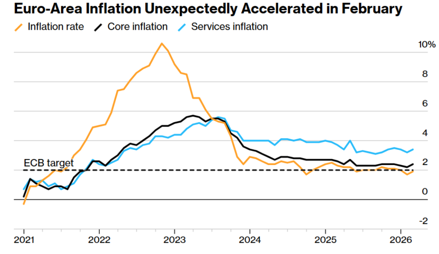 Инфлацијата во еврозоната неочекувано забрза, што ја поткрепи претпазливоста на Европската централна банка (ЕЦБ) во врска со каматните стапки, особено затоа што војната во Иран ги зголемува цените на енергијата.