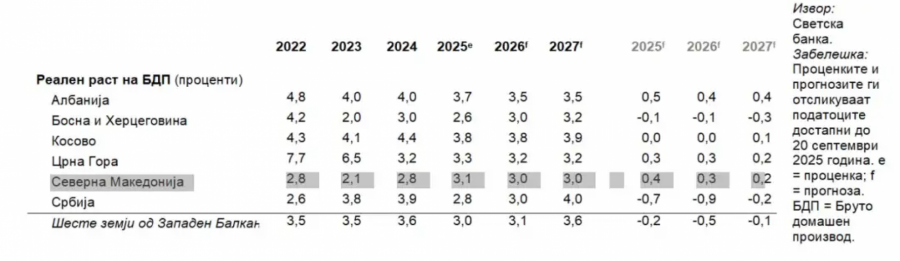 Реален раст на БДП од 3,1 отсто во 2025 година и од 3 отсто во 2026 и 2027 година се процените на Светската банка за земјава. Според последниот извештај, разликата во процентни поени од проекциите во пролетниот извештај за 2025 година е во нагорна линија и изнесува 0,4, 0,3 и 0,2 за овие три години.
