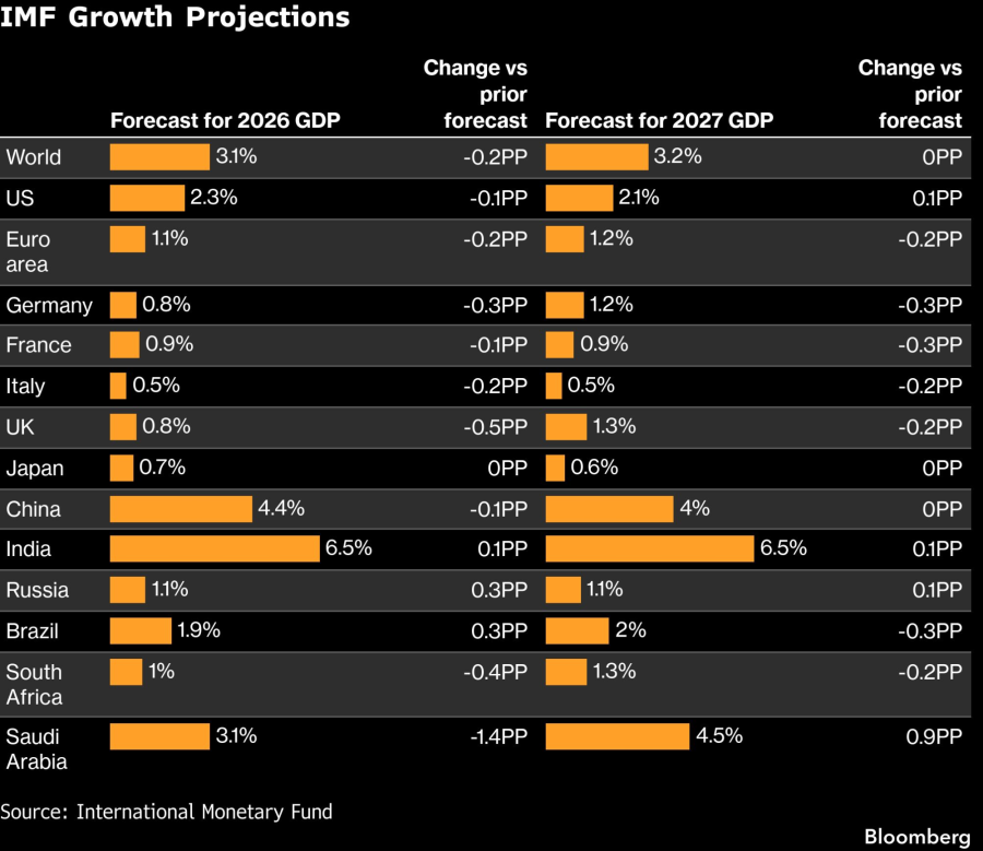 Според новиот извештај World Economic Outlook, глобалниот БДП сега се очекува да порасне за 3,1% оваа година, што е намалување од претходната прогноза од 3,3% во јануари. Проекцијата се базира на претпоставка за релативно краток конфликт и умерен раст на цените на енергентите.