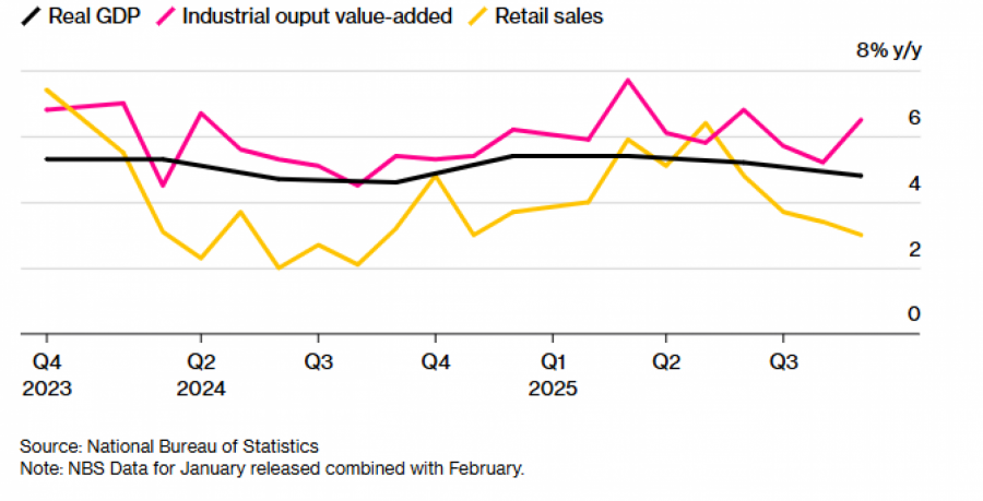 Кина ја одржува економската динамика благодарение на рекордниот извоз, поттикнат од глобалната побарувачка за нејзините производи, што го задржува вкупниот раст блиску до целта на владата и покрај новата трговска војна со САД. Сепак, ранливостите остануваат во втората по големина економија во светот, бидејќи дефлацијата и прекумерната конкуренција ја намалуваат добивката на компаниите, додека потрошувачката сè уште тешко закрепнува по колапсот на пазарот на недвижности.
