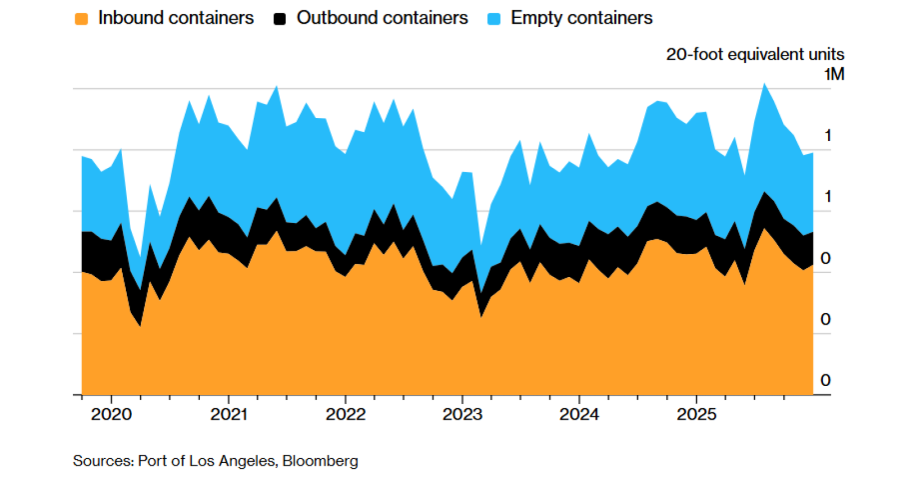 Вкупниот контејнерски сообраќај преку пристаништето во Лос Анџелес во јануари падна за 12 отсто, откако и извозот и увозот ослабнаа во однос на истиот период лани, кога превозниците брзаа да префрлат стока во очекување на царините на американскиот претседател Доналд Трамп.