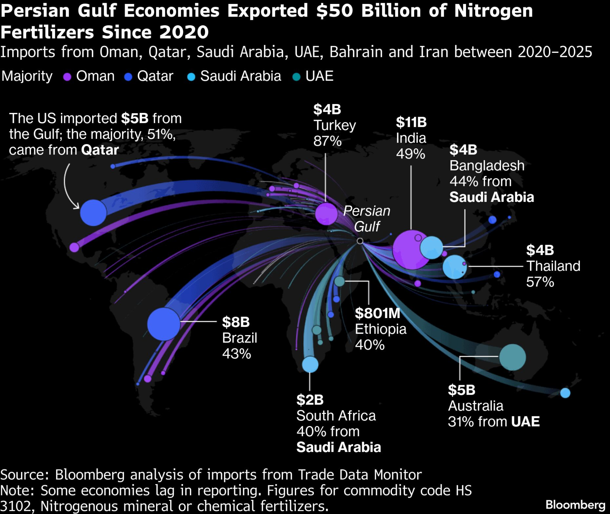 Економиите во Персискиот Залив извезоа азотни ѓубрива во вредност од 50 милијарди долари од 2020 година - увоз од Оман, Катар, Саудиска Арабија, ОАЕ, Бахреин и Иран, 2020-2025 година.