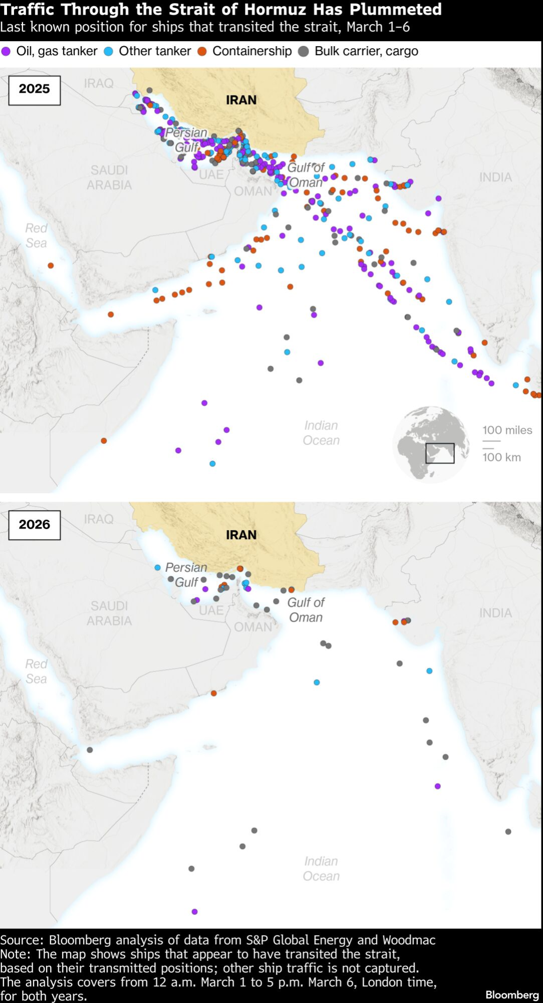 Само мал број бродови поминаа низ теснецот од минатата сабота, кога САД и Израел извршија воздушен напад врз Иран. Техеран возврати, лансирајќи дронови и ракети кон цели ширум Заливот. Анализата на податоците за бродскиот транспорт од 1 до 6 март покажува дека сообраќајот на трговските бродови околу Ормускиот теснец опаднал за повеќе од 85 отсто во однос на истиот период минатата година; околу една петтина од овие премини биле надвор од видокругот на системот за автоматска идентификација на бродови.