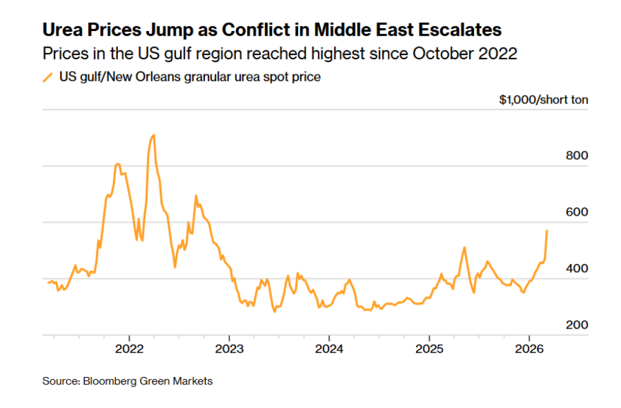 Реакцијата на пазарот на војната беше брза и драматична. Цените на уреата во САД, која широко се користи за култивирање на пченка се зголеми за околу 100 долари за тон во рок од една недела, достигнаа 570 долари тон што е највисоко ниво од октомври 2022 година, според „Блумберг грин маркетс“.