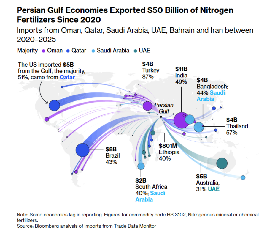 Ризикот за земјоделство станува се поголем поради блокадата на Ормускиот теснец кој е клучен и за транспорт на суровини за производство на ѓубривата. Имено, Блискиот Исток е најголем извозник на овие суровини, за илустрација во периодот од 2020 до 2025 година, САД потрошиле 5 милијарди долари за увоз од земјите од заливот, а над половина од сумата завршила во Катар. Економиите од Персискиот залив во истиот период имале извоз на азотни ѓубрива во вредност од 50 милијарди долари.