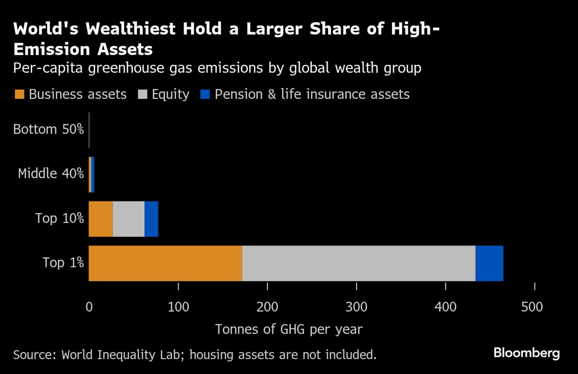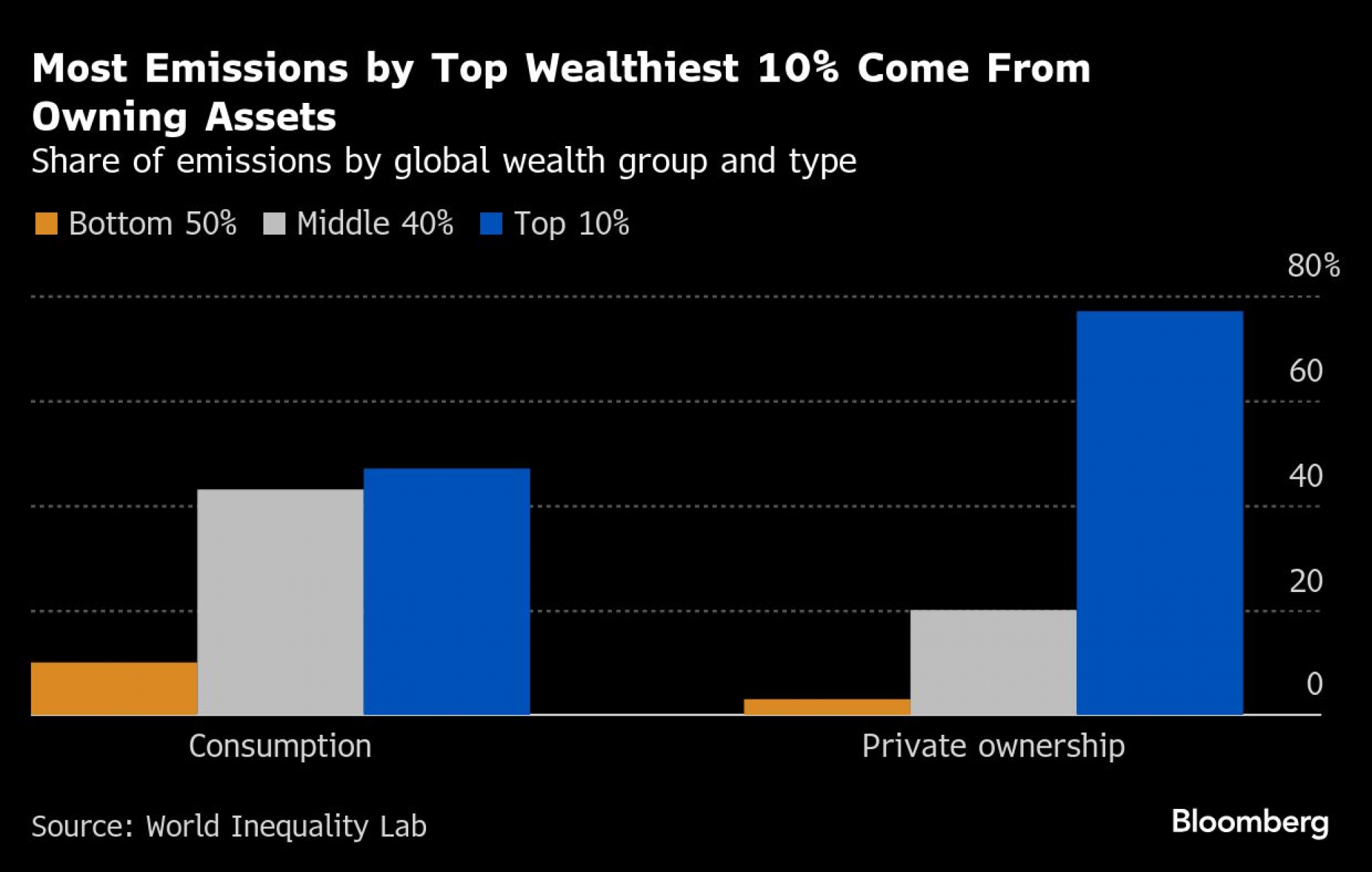 Според анализата на „Ворлд инеквалити лаб“, најбогатиот еден процент од светската популација е одговорен за 15 проценти од емисиите што се припишуваат на потрошувачите. Но, кога нивниот јаглероден отпечаток се мери преку имотот со кој располагаат, тој удел се зголемува на околу 40 проценти.