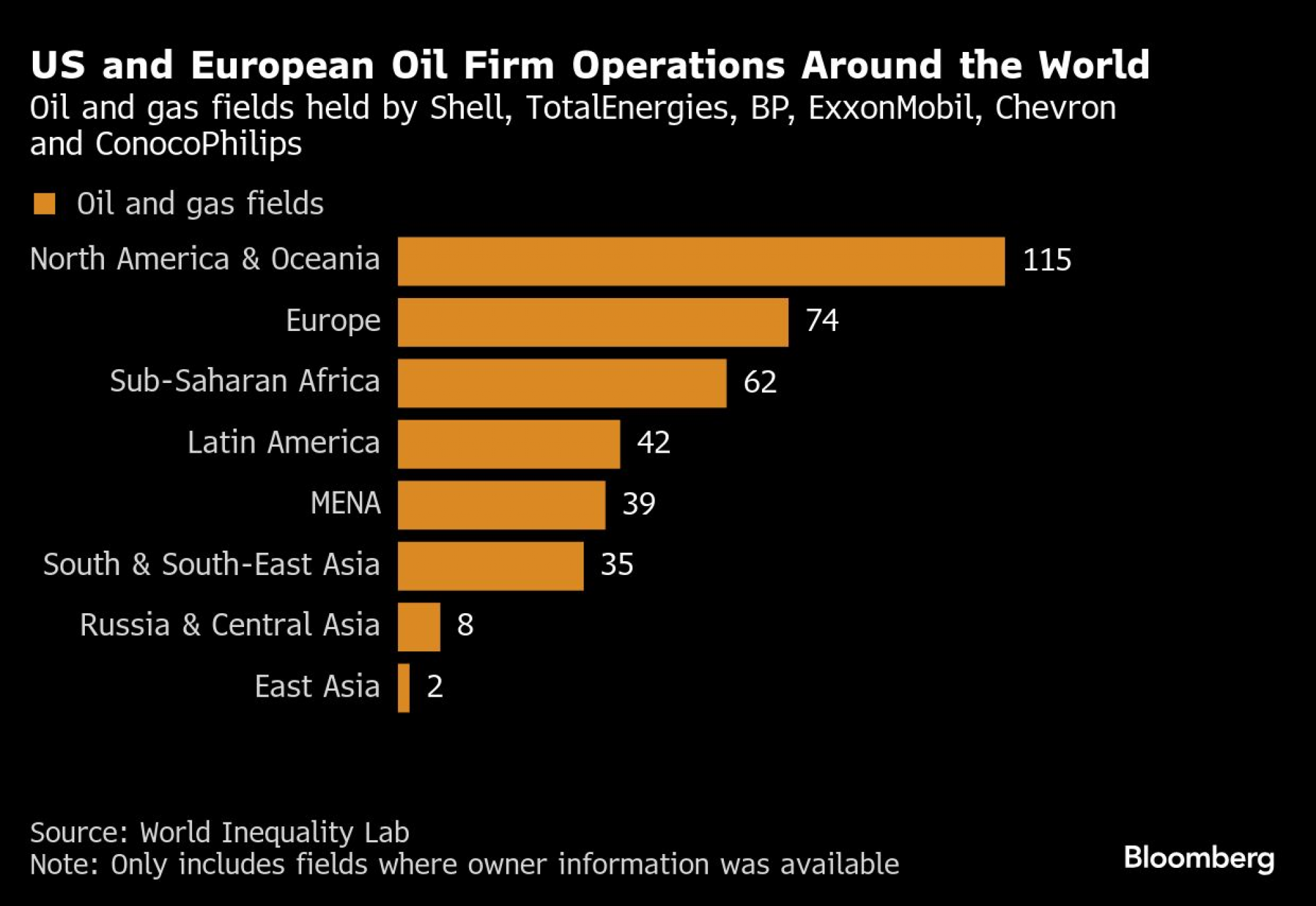 Истражувачите се занимавале и со тоа каде работат тие компании. Околу половина од нафтените и гасните полиња во сопственост на шесте најголеми светски нафтени компании со седиште во Европа и Северна Америка се наоѓаат во земјите од глобалниот Југ.