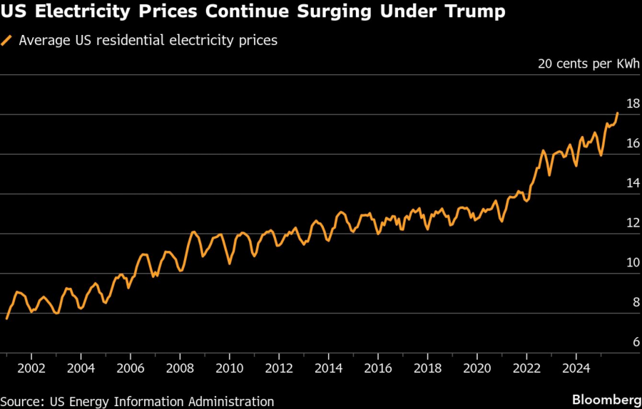 Трамп вети дека ќе ги преполови цените на електричната енергија во рок од една година од преземањето на функцијата. Наместо тоа, тие се зголемија поради силниот раст на побарувачката. На национално ниво, просечната малопродажна цена на електричната енергија се зголеми за 7,4 проценти во септември, на рекордни 18,07 центи за киловат-час, што е најголемо зголемување од декември 2023 година, според најновите официјални податоци. Цените за домување се зголемија уште повеќе, за 10,5 проценти помеѓу јануари и август 2025 година, едно од најголемите зголемувања за повеќе од една деценија, според Националното здружение на директори на програми за енергетска помош.