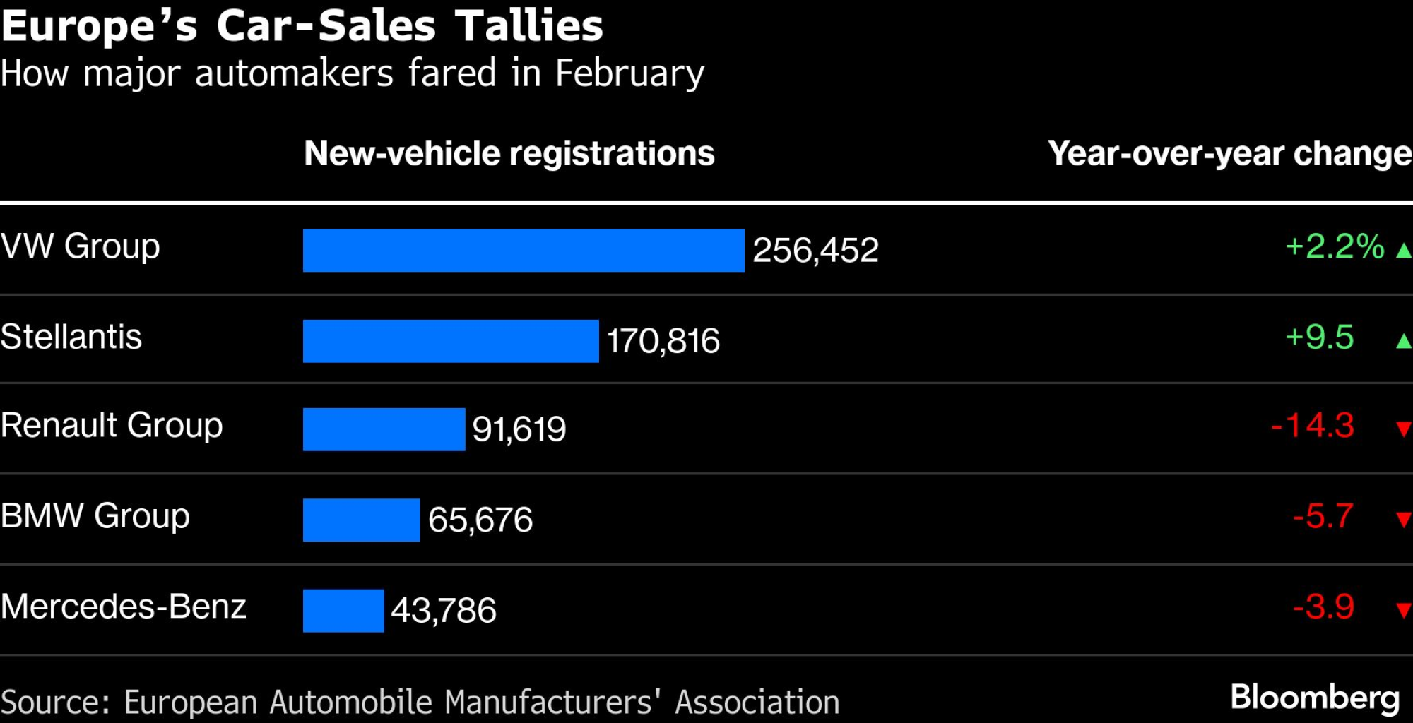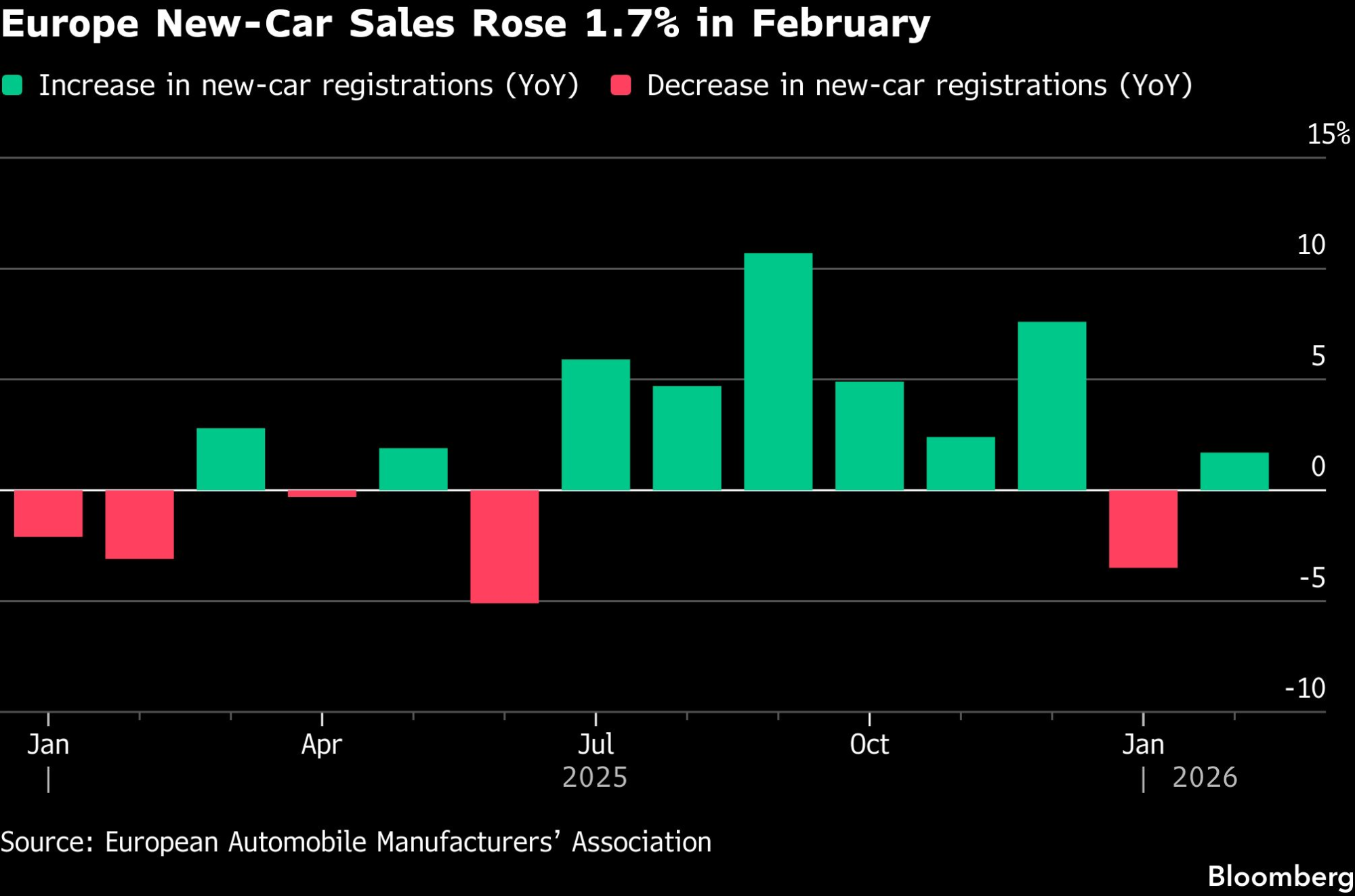 Регистрациите на нови возила во февруари се зголемија за 1,7 отсто во споредба со истиот период минатата година, на вкупно 979.321 возило, соопшти во вторникот Европската асоцијација на производители на автомобили. Растот го предводеа пазарите на Германија, Шпанија, Италија и Обединетото Кралство, додека Франција забележа пад од речиси 15 отсто.