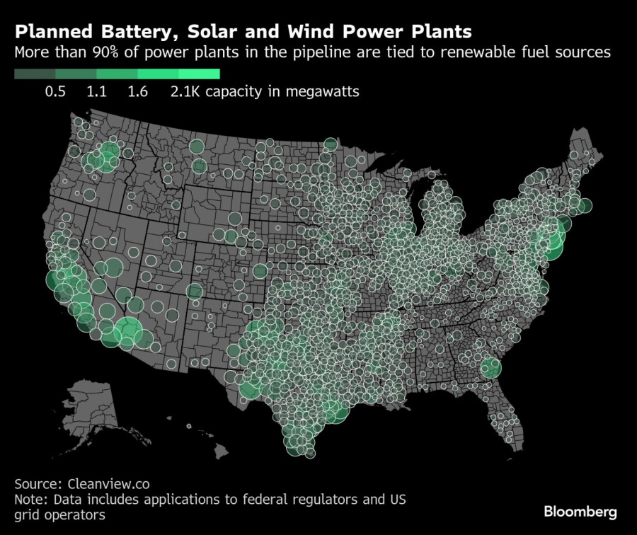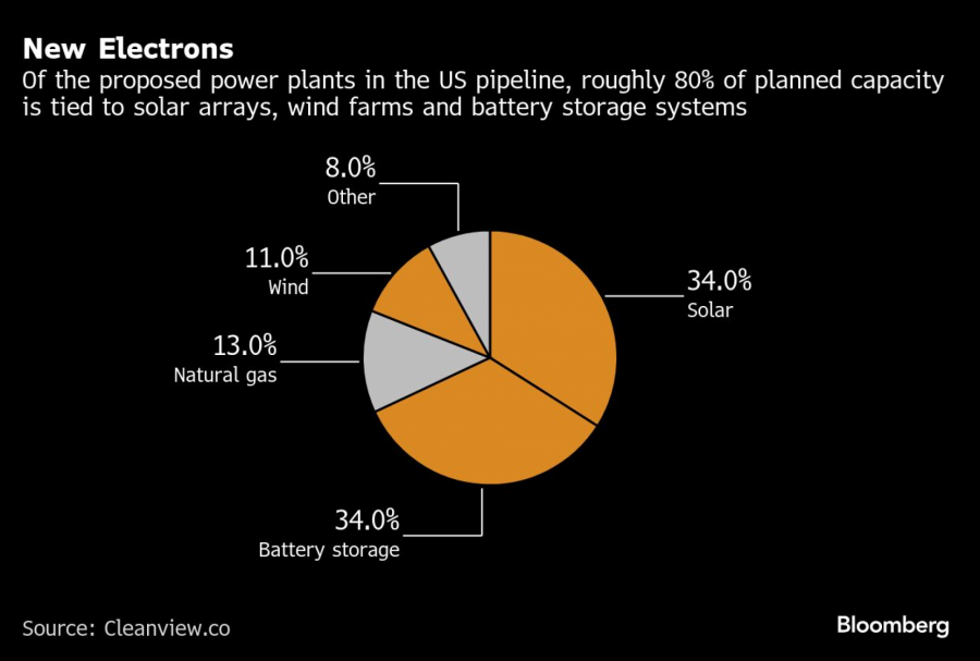 Обновливите извори засега остануваат најбрзиот и најевтин начин за додавање нова моќ на електромрежата. Речиси 80 отсто од најавените капацитети се проекти од обновливи извори, покажуваат податоците на „Клинвју“ (Cleanview), собрани од пријавите до федералните регулатори и операторите на мрежата. За споредба, природниот гас и нуклеарната енергија, кои американскиот претседател Доналд Трамп ги претпочита како основа за идните ВИ-системи, учествуваат со околу 14 отсто од планираниот капацитет.