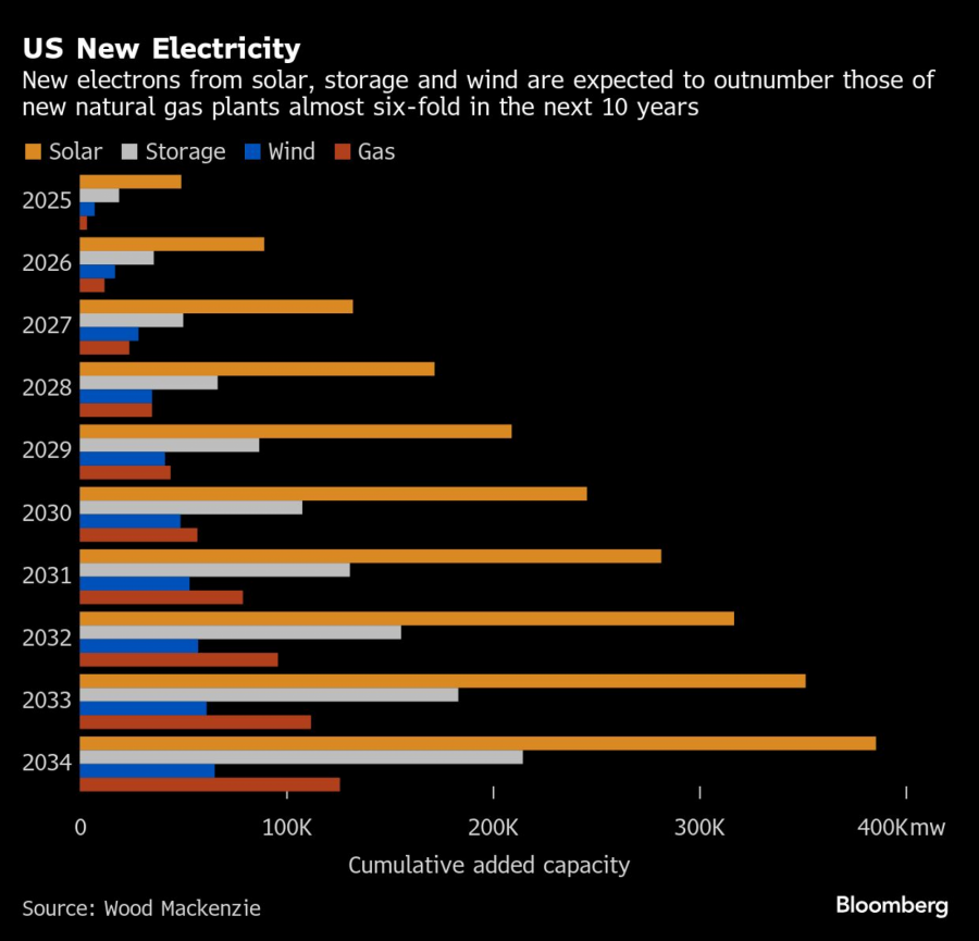 Во крајна линија, јазот меѓу брзината на изградба на центрите за податоци и побавниот раст на енергетските капацитети би можел дополнително да ги поттикне обновливите извори. „Вуд Мекензи“ проценува дека укинувањето на зелените стимуланси го намалило нивниот планиран раст за само 8 отсто. До 2034 година, американските комунални претпријатија би можеле да додадат уште 666 гигавати соларна енергија, батериски системи и ветер, наспроти само 126 гигавати нови гасни централи.