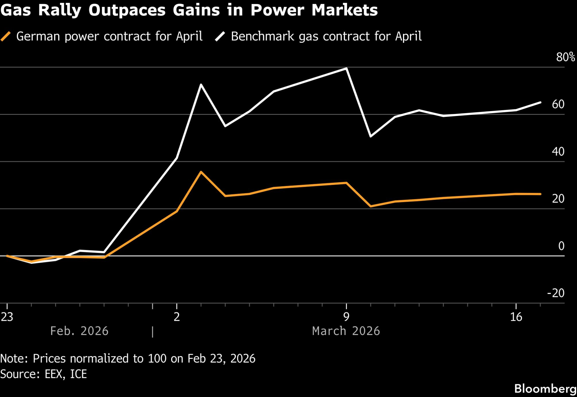 Цените во Германија и Франција се покажаа постабилни отколку кај гасот, кој е чувствителен на шокови поврзани со војната на Блискиот Исток. Минатата недела тие дури малку паднаа, иако цената на нафтата значително порасна.