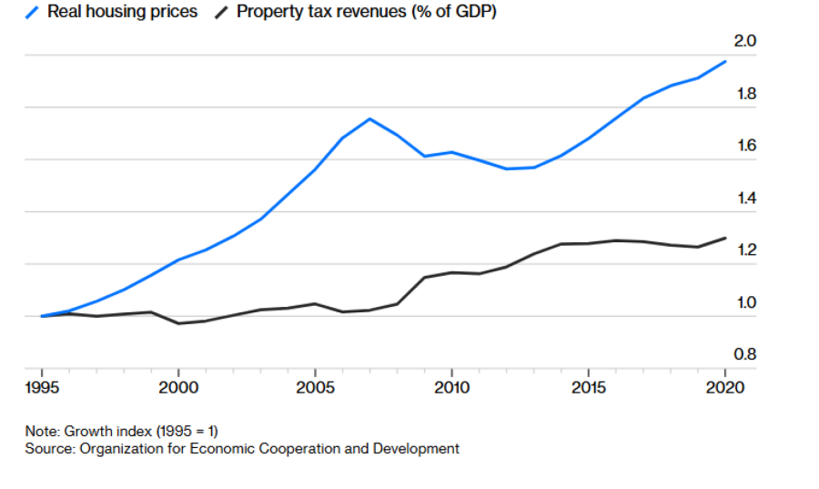 Просечен раст на реалните цени на домување и приходите од повторлив данок на имот во 15 развиени земји