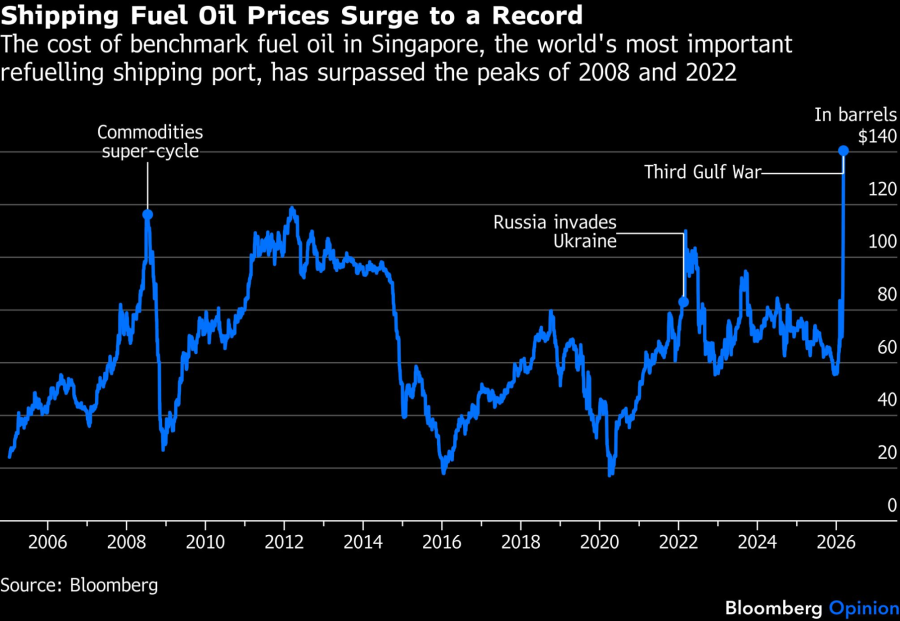 Цените на мазутот за превоз скокнаа на рекорд | Цената на референтното гориво во Сингапур, најважното пристаниште за полнење гориво во светот, ги надмина врвовите од 2008 и 2022 година/Bloomberg Opinion