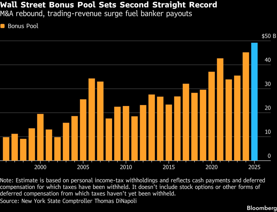 Вкупниот фонд е најголем откако се води евиденција од 1987 година, што го одразува закрепнувањето на спојувањата и преземањата поттикнато од поблага регулатива за време на претседателот Доналд Трамп. Ди Наполи посочи и на силната активност во тргувањето и во издавањето хартии од вредност. Овој резултат означува втора последователна година на рекордни бонуси за вработените во секторот за хартии од вредност.