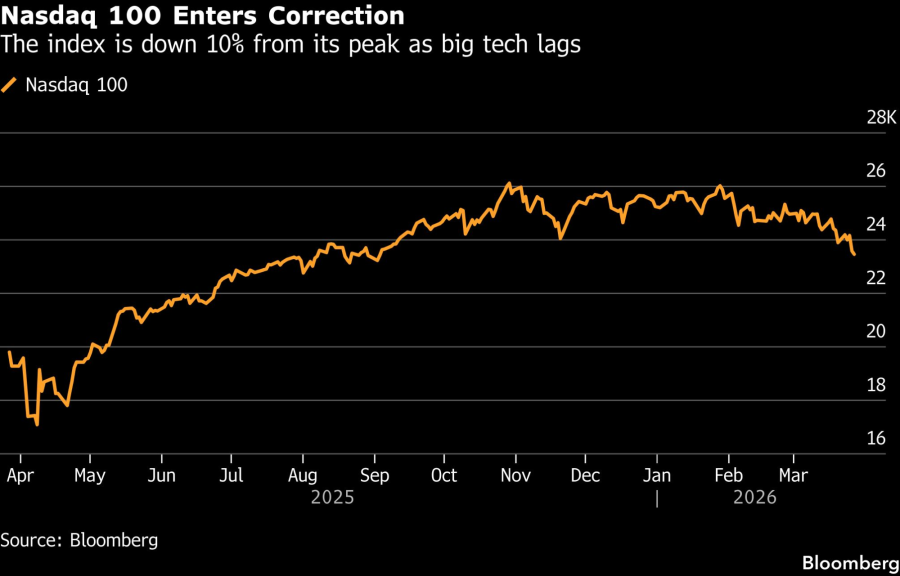 Технолошкиот бенчмарк падна за 1,24 отсто на 23.294 поени до моментот на пишување на овој текст, со што индексот практично загуби над 11 отсто од вредноста од пикот достигнат во октомври 2025-та. Ова е прв пат откако царините на американскиот претседател Доналд Трамп предизвикаа пад на акциите во април 2025 година, Nasdaq 100 да падне во техничка корекција, која се дефинира како пад од најмалку 10 отсто, но помалку од падот на „мечкиниот пазар“ од 20 отсто.