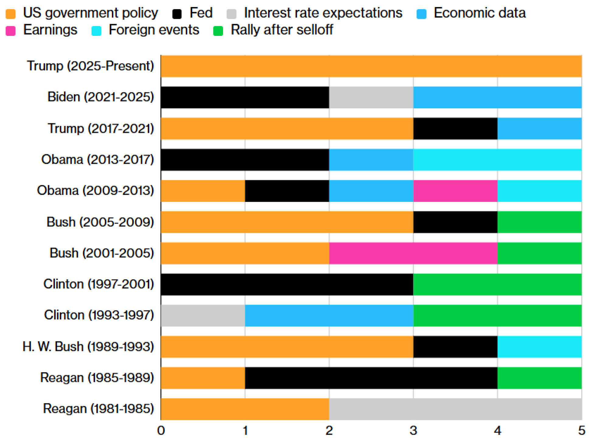Од преземањето на функцијата минатиот јануари, коментарите на Трамп пред новинарите на импровизирани собири во Овалната соба и на формални прес-конференции, како и неговите објави на социјалните мрежи, биле главниот двигател зад петте најдобри и најлоши денови на индексот S&P 500, според анализа на „Фандстрат рисрч“ (Fundstrat Research). Тоа е влијание какво што немал ниту еден современ американски лидер. Ниту еден друг претседател не оркестрирал толку најдобри и најлоши денови низ дванаесет администрации, наназад до претседателот Роналд Реган во 1981 година.