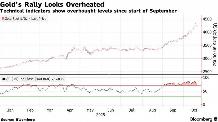 Техничките индикатори, вклучувајќи го индексот на релативна сила, RSI, укажуваат дека силното зголемување на цените на благородните метали што започна во август – и што минатата недела ги турна златото и среброто на нови рекордни нивоа – можеби е прегреано, отворајќи можност за корекција.