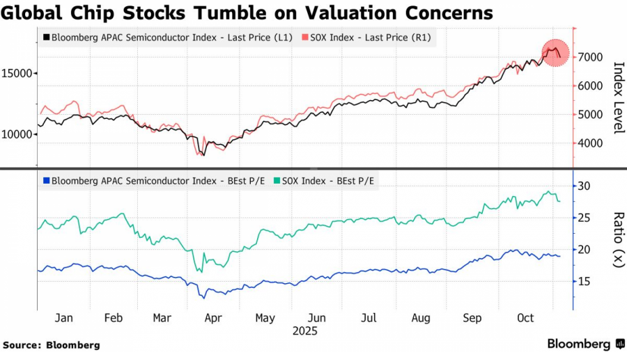 Глобалната продажба на акции на производителите на полупроводници се засили поради загриженост околу преголемите вреднувања на некои од најголемите добитници од подемот на вештачката интелигенција.