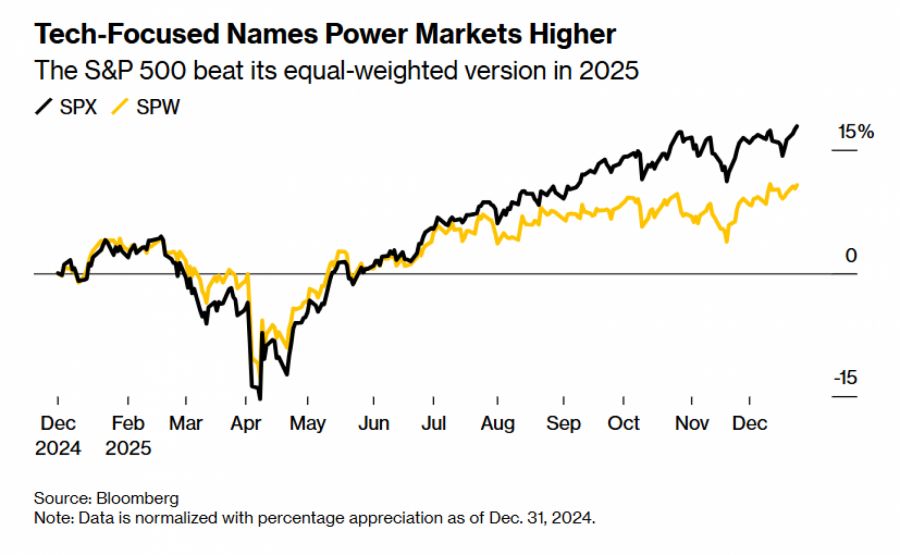 Истата динамика беше видлива и на ниво на индекс. Во текот на годината, S&P 500 го надмина својот еднакво-тежински еквивалент, кој му дава исто значење на мал трговец како и на „Епл“.