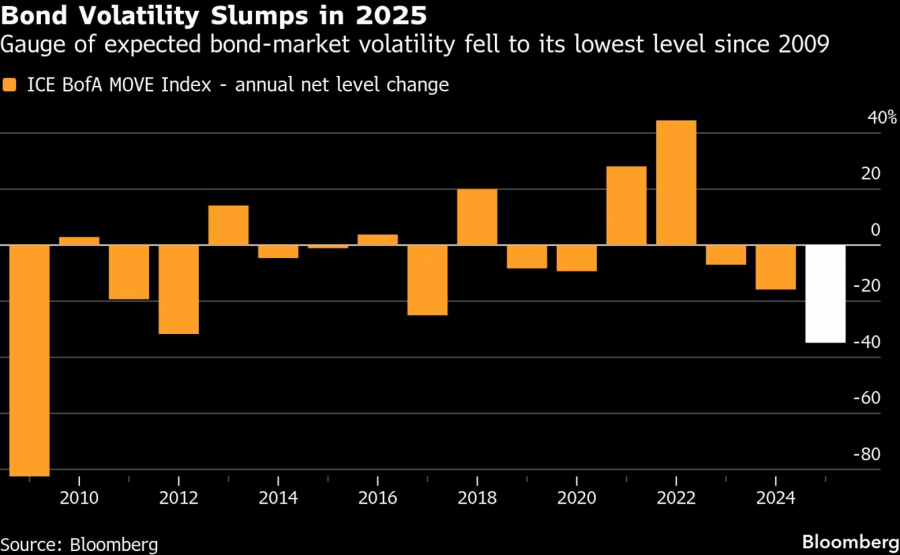Нестабилноста нагло се намали, а кредитите го следеа примерот. Мерките за осцилациите на американскиот пазар на обврзници го забележаа својот најстрмен годишен пад по финансиската криза, додека инвестициските распони се стеснија трета година по ред, оставајќи ги просечните премии за ризик под 80 базични поени.
