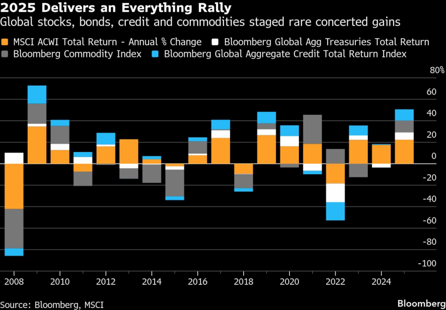 Мерено низ глобалните акции, обврзници, кредити и стоки, 2025 година го испорача најсилниот резултат меѓу средствата од 2009 - годината обележана со проценки на ниво на криза и сеопфатна политичка интервенција.