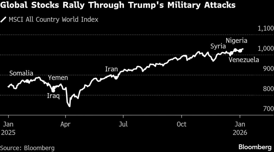 Наместо чувство на нелагодност по упадот на Вашингтон во Венецуела за време на викендот, акциите во понеделникот глобално достигнаа нови максимуми, како и берзанските индекси во Азија и на пазарите во развој. Растот на акциите го повтори образецот забележан и во деновите по американските напади минатата година во Ирак, Јемен, Иран и Сирија.