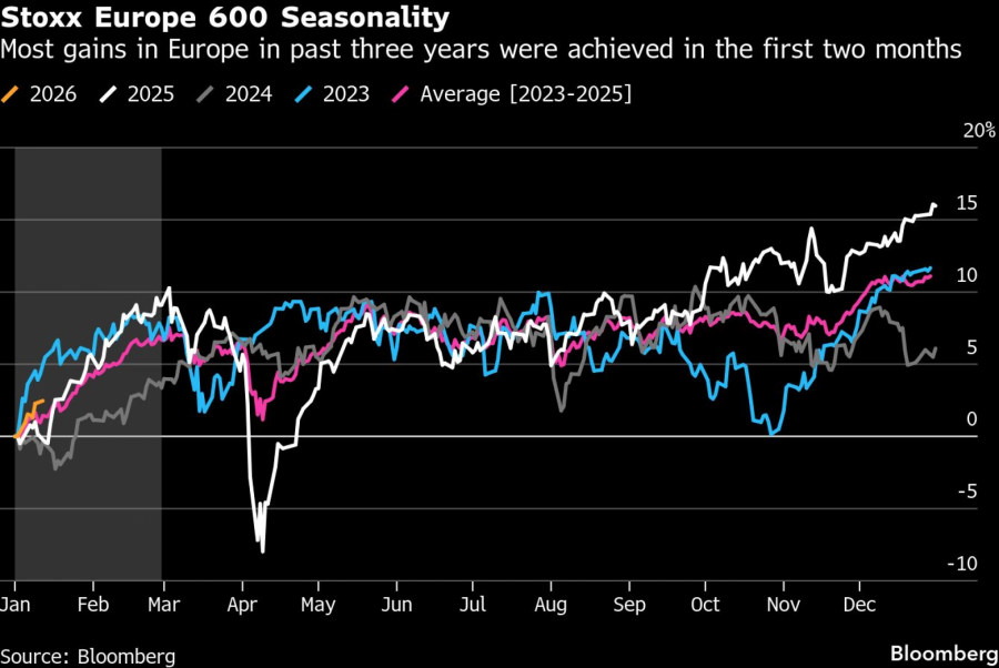 Индексот Stoxx Europe 600 оваа година е во пораст од 3,2 проценти, по скокот од 17 отсто во 2025 година. Овој референтен индекс веќе има предност пред индексот S&P 500, кој е во пораст од само 1,9 отсто. Откако минатата година почнаа да се појавуваат пукнатини во идејата за таканаречената „американска исклучителност“, инвеститорите ја ротираа својата изложеност од американските средства кон остатокот од светот.