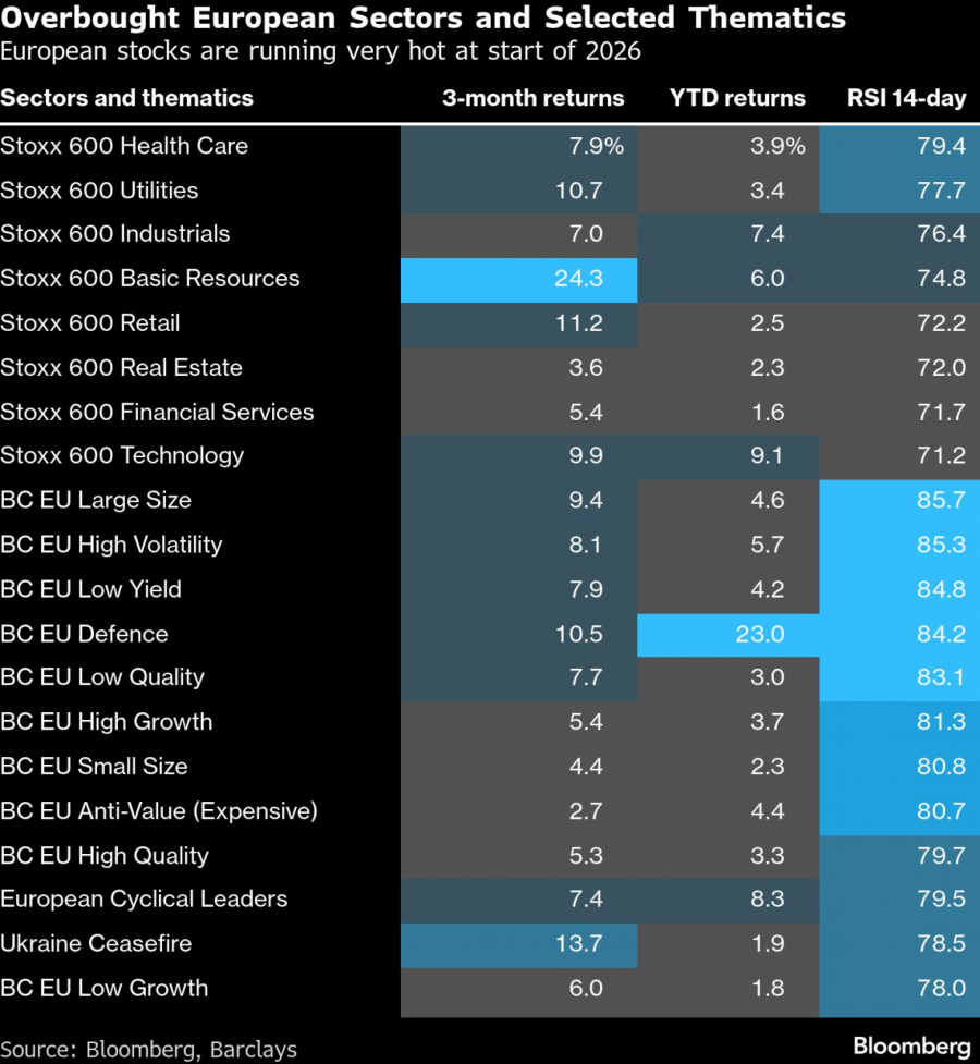 И не изгледа растегнато само главниот европски репер. Осум секторски индекси исто така трепкаат на прекупени нивоа: технологија, индустрија, основни ресурси, здравствена заштита, комунални услуги, малопродажба, недвижности и финансиски услуги. Во меѓувреме некои делови од пазарот се екстремно жешки. Тие вклучуваат одбранбени акции и стратегии насочени кон акции со низок квалитет, висока нестабилност и скапи акции.