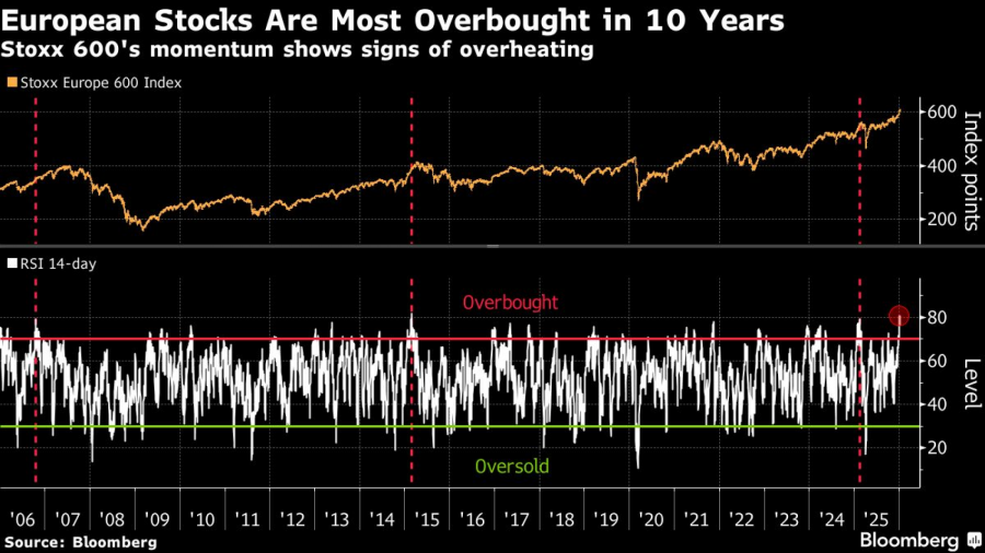 „Секако, со ова ниво на прекупеност секогаш постои ризик од повлекување“, рече Томас Зловодски, раководител на стратегии за акции во „Одо“ (Oddo BHF). „Сосема е јасно дека европските пазари не можат да продолжат да се искачуваат со тоа темпо.“