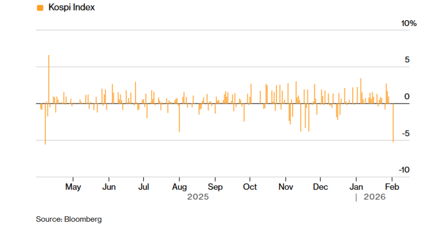 Нервозата околу номинацијата на Кевин Ворш за следен претседател на Федералните резерви дополнително се засили по изјавата на извршниот директор на „Енвидија“ (Nvidia Corp.), Џенсен Хуанг, дека предложената инвестиција од 100 милијарди долари во „Опен еј-ај“ (OpenAI) „никогаш не била обврска“. Прашањето сега е дали овој пад е само краткотрајна пауза во растечкиот тренд на Kospi или почеток на подлабока корекција.